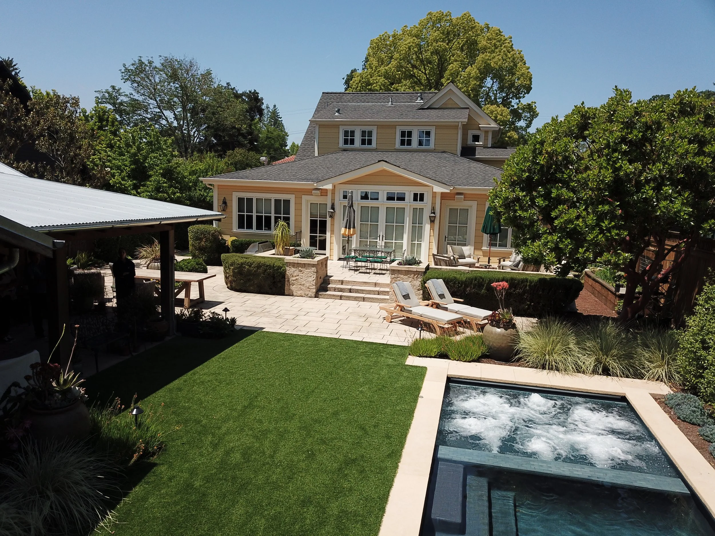 Located on the walkable east side of Sonoma proper, this charmingly renovated farmhouse is now complete with the addition of a swimming pool. A lawn and planting area were removed in the rear garden to include what seemed like an impossible feat on a compact lot, space for a swimming pool and integrated hot tub. Limestone was used to create an integrated water feature wall at the rear of the pool, layering in planting to provide visual interest and softening the rear fence. This dark bottomed pool offers a sophisticated aesthetic to the landscape with adjacent turf and planting to provide the feeling of a serene garden space.